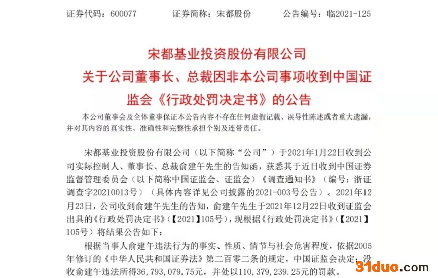 因涉嫌内幕交易,宋都股份董事长收到了证监会开出的巨额罚单。