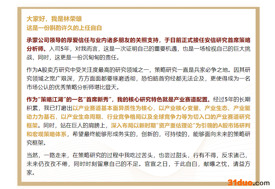 据林荣雄介绍,他于2017年初加入新组建的安信策略团队,至今已有近5年的策略分析师从业的经历。尽管已升任首席策略分析师,不过他仍然称自己是“策略江湖”的一名“首席新秀”。