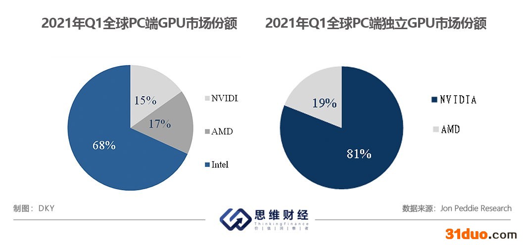 目前,全球GPU市场依然处于寡头竞争格局。根据Jon Peddie Research数据,2021年Q1,在全球PC端GPU市场中,Intel以68%的市场份额位居榜首,AMD和NVIDIA分别以17%和15%的市场份额名列第二和第三;在PC端独立GPU领域中,NVIDIA占据81%的市场份额,AMD则以19%排名第二。Intel、NVIDIA和AMD三巨头分食了全球市场。