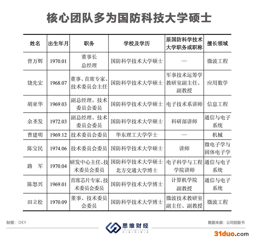 从核心团队层面,据招股书,公司的实控人曾万辉及喻丽丽夫妇在加入景嘉微前,均任职于北京新神剑经济技术发展有限公司,据企查查,该公司的实控人为国防科工委华北企业局,而曾万辉本身也是国防科技大学硕士,包括公司后续加入的高管,也大多是国防科技大学硕士。