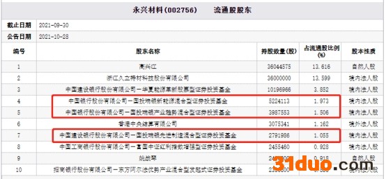 截至2021年9月30日,永兴材料的前十大流通股东中,国投瑞银旗下基金占据3席。