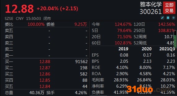 官网信息显示,雅本化学股份有限公司成立于2006年,是一家国内领先的医药及农药精细化学品定制生产商。二级市场上,Wind数据显示,雅本化学股价在12月21日、12月22日连续两日涨停,截至12月23日下午收盘,雅本化学股价报12.88元。(中新经纬APP)