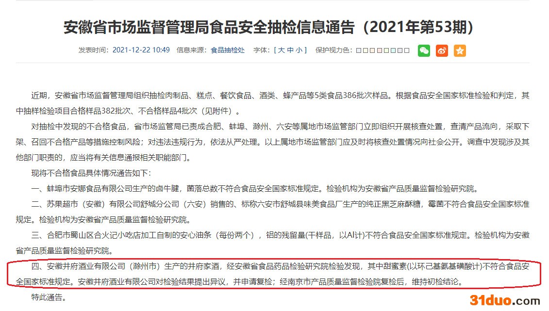 其中,安徽井府酒业有限公司(滁州市)生产的井府家酒,经安徽省食品药品检验研究院检验发现,其中甜蜜素(以环己基氨基磺酸计)不符合食品安全国家标准规定,检验结果为0.313mg/kg,标准值为不得使用。该批次产品规格型号为500mL/瓶、46%vol,生产日期为2021年1月4日。安徽井府酒业有限公司对检验结果提出异议,并申请复检;经南京市产品质量监督检验院复检后,维持初检结论。