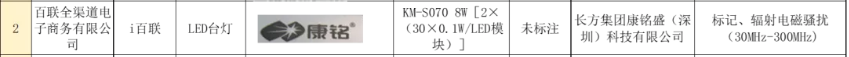 其中,百联全渠道电子商务有限公司在i百联销售的标称由长方集团康铭盛(深圳)科技有限公司生产的“康铭”牌LED台灯(规格型号:KM-S070 8W[2×(30×0.1W/LED模块)];生产日期未标注),标记、辐射电磁骚扰(30MHz-300MHz)项目不合格。该批次产品辐射电磁骚扰(30MHz-300MHz)在47.6Hz的准峰值实测为70.01dBμV(标准要求应≤60.17μV),与标准要求不符。