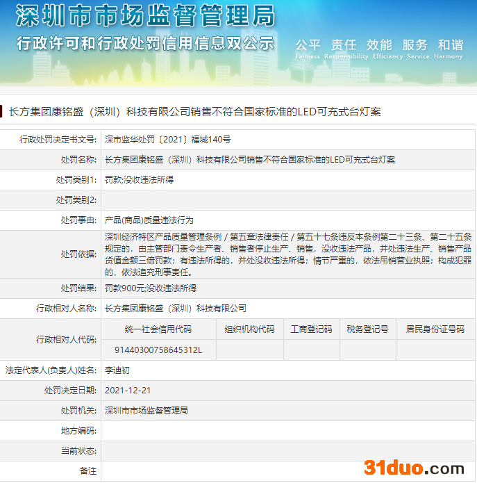 同日,深圳市市场监督管理局网站也公示了长方集团康铭盛(深圳)科技有限公司销售不符合国家标准的LED可充式台灯案。行政处罚决定书(深市监华处罚〔2021〕福城140号)显示,长方集团康铭盛(深圳)科技有限公司因产品(商品)质量违法行为,被深圳市市场监督管理局罚款900元并没收违法所得。处罚依据为《深圳经济特区产品质量管理条例》第五十七条。