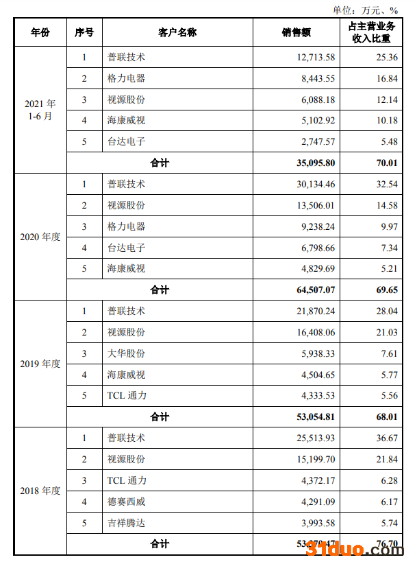 值得注意的是,满坤科技的客户基本上均为相应行业的佼佼者。在消费电子方面,公司客户主要包括视源股份、格力电器、洲明科技等上市公司;在工控安防方面,像海康威视、台达电子、康舒科技等行业领先者也是满坤科技的重要客户。然而,满坤科技客户集中度较高却也是不争的事实。2018至2021年上半年,公司前五大客户的销售收入占主营业务收入的比例分别为76.70%、68.01%、69.65%和70.01%,历年皆在7成左右。其中,普联技术为公司报告期内第一大客户,销售收入占比分别为36.67%、28.04%、32.54%和25.36%。