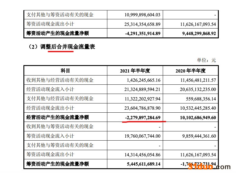 据调整合并现金流量表数据显示,广州合景控股的合并经营活动产生的现金流量净额,由原来的74.57亿元,下降至-22.79亿元,该项指标金额直接下降97.36亿元;合并筹资活动产生的现金流量净额,由原来的-42.91亿元上升至54.45亿元,该项指标金额97.36亿元。