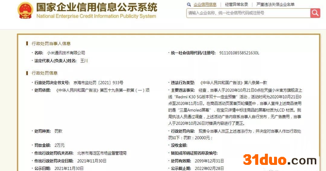 北京市海淀区市场监督管理局认为,该公司上述行为违反了《中华人民共和国广告法》第八条第一款。依据《中华人民共和国广告法》第五十九条第一款第(一)项,该局责令小米通讯技术有限公司改正违法行为并罚款2万元。处罚决定日期为2021年11月30日。