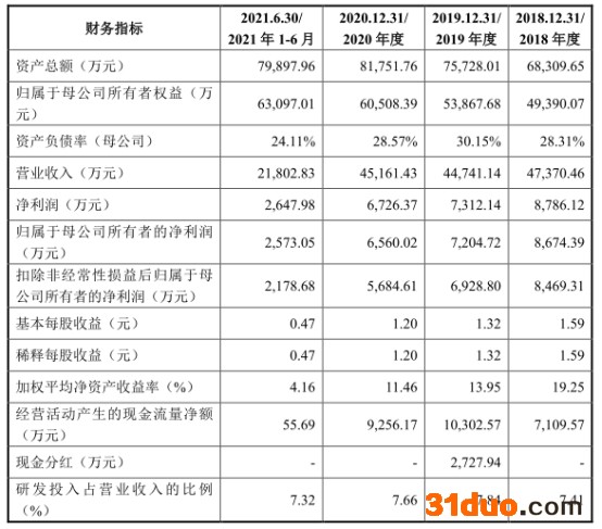 2018年至2021年1-6月,公司实现营业收入分别为4.74亿元、4.47亿元、4.52亿元、2.18亿元;实现归属于母公司所有者的净利润分别为8674.39万元、7204.72万元、6560.02万元、2573.05万元;实现扣除非经常性损益后归属于母公司所有者的净利润分别为8469.31万元、6928.80万元、5684.61万元、2178.68万元;实现经营活动产生的现金流量净额分别为7109.57万元、1.03亿元、9256.17万元、55.69万元。