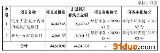 超达装备最终募集资金净额比原计划多261.08万元。超达装备于12月9日披露的招股书显示,公司拟募集资金4.45亿元,分别用于汽车大型复杂内外饰模具扩建项目、研发中心扩建项目。