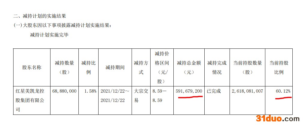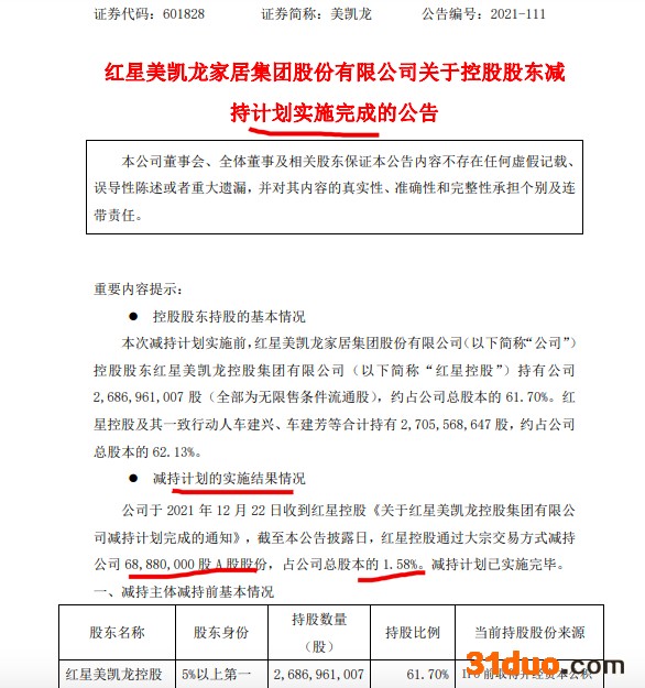 中华网财经12月23日讯:红星美凯龙家居集团股份有限公司(简称:美凯龙,601828.SH)发布公告称,公司控股股东红星控股于12月22日通过大宗交易方式减持公司68,880,000股A股股份,占公司总股本的1.58%,该减持计划已实施完毕。