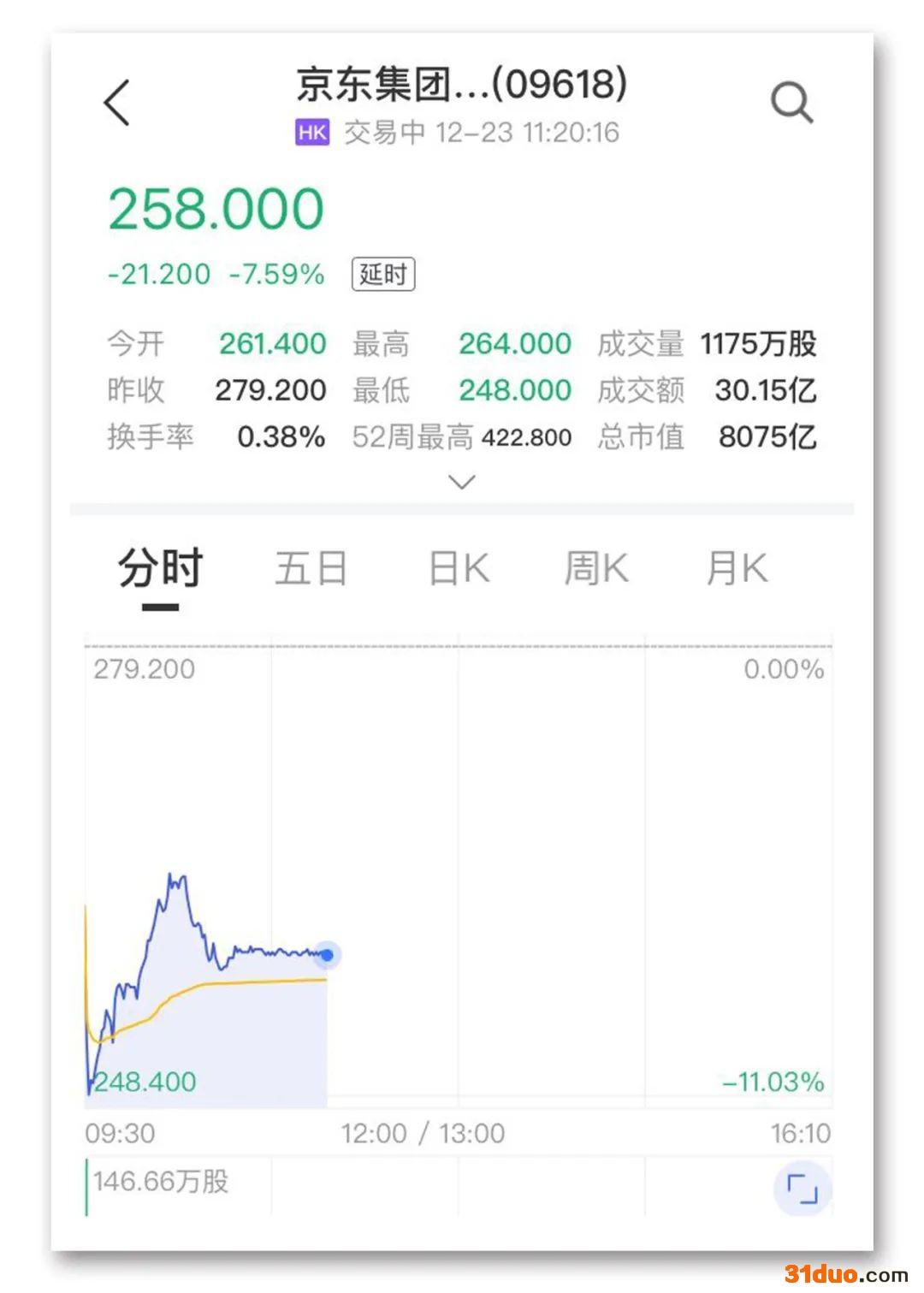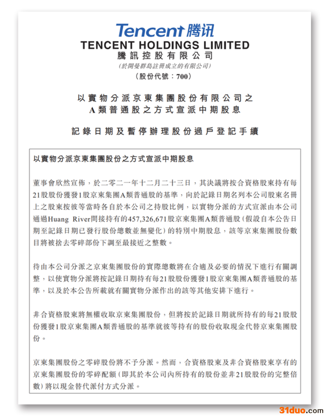 12月23日早间,腾讯控股在港交所发布公告称,董事会宣布,于2021年12月23日,决议将按合资格股东持有每21股股份获发1股京东集团A类普通股的基准,向于记录日期名列本公司股东名册上之股东按彼等当时各自于本公司之持股比例,以实物分派的方式宣派由本公司通过Huang River间接持有的457326671股京东集团A类普通股(假设自本公告日期至记录日期已发行股份总数并无变化)的特别中期股息,该等京东集团股份数目将被舍去零碎部份下调至最接近之整数。