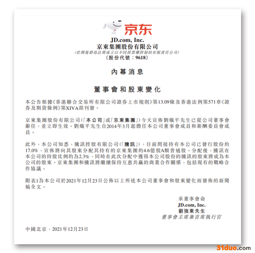 同时,京东集团也在港交所发布公告称,刘炽平已从公司董事会辞任,并立即生效。公司知悉,腾讯控股有限公司目前间接持有本公司已发行股份约17%,宣布将向其股东分配其持有的京东集团约4.6亿股A类普通股。分配后,腾讯在本公司的持股比例约为2.3%,同时在此次分配中获得本公司股份的腾讯的股东将成为本公司的股东。