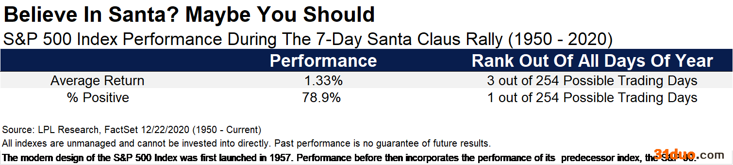 在这七个交易日里,美股上涨的可能性有多大呢?LPL Financial的统计显示,美股历史上没有哪一段的七天组合会比“圣诞老人行情”期间表现更佳,过去70年标普500指数在这个七个交易日里有78.9%的几率走高。