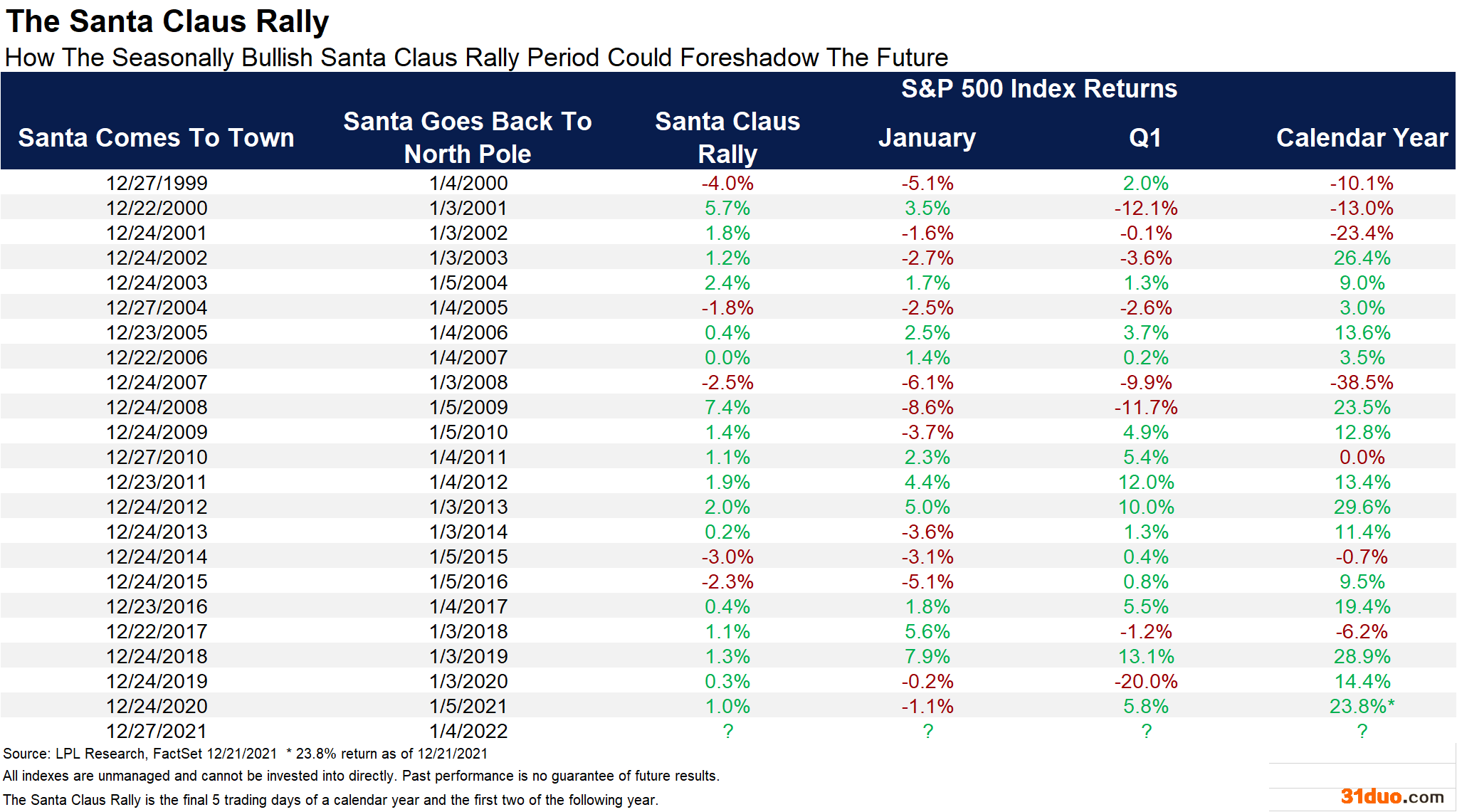 LPL Financial在报告中,还统计了自2000年以来“圣诞老人行情”后的美股表现。如下图所示,通常若标普500指数能在这七天走强,往往也会成为1月和此后来年市场表现的一个好兆头。