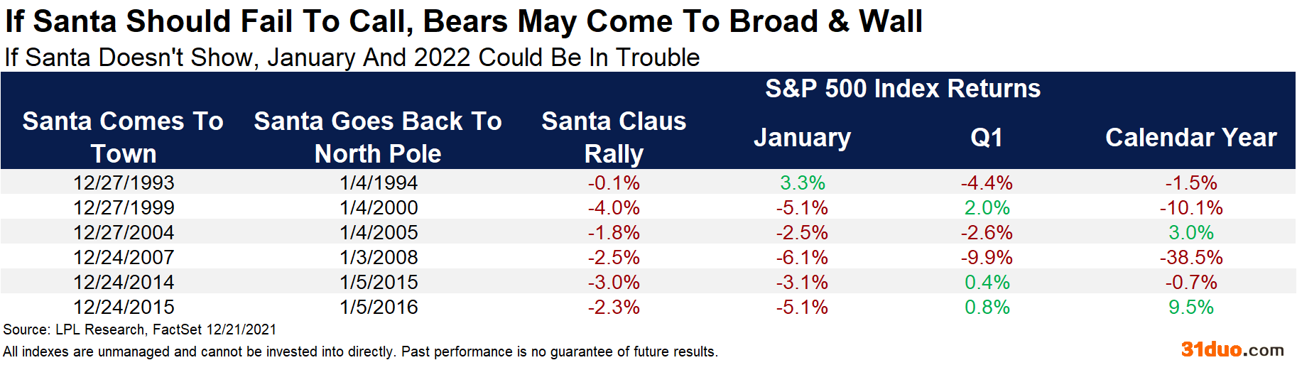 不过,相比这些“圣诞老人”送出大礼情况更为令人印象深刻的是,每当“圣诞老人”没有出现,美股面临“坏兆头”的概率要更高。