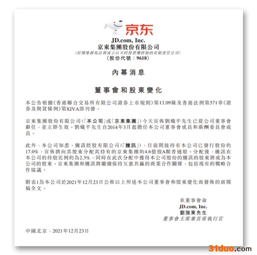 同时,京东集团也在港交所发布公告称,刘炽平已从公司董事会辞任,并立即生效。公司知悉,腾讯控股有限公司目前间接持有本公司已发行股份约17%,宣布将向其股东分配其持有的京东集团约4.6亿股A类普通股。分配后,腾讯在本公司的持股比例约为2.3%,同时在此次分配中获得本公司股份的腾讯的股东将成为本公司的股东。