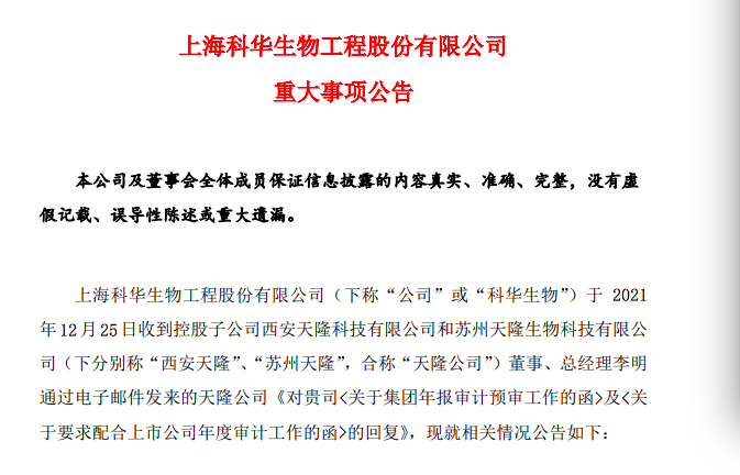 科华生物在12月27日晚间公告中披露,天隆公司作为科华生物的控股子公司,纳入科华生物的合并财务报表范围内,为了保证科华生物2021年度合并财务报告以及控股子公司天隆公司2021年财务报告的审计工作能够按时、顺利完成,公司于2021年12月16日和12月17日分别向天隆公司及其董事、监事和财务总监发送了科华生物《关于要求配合上市公司年度审计工作的函》。