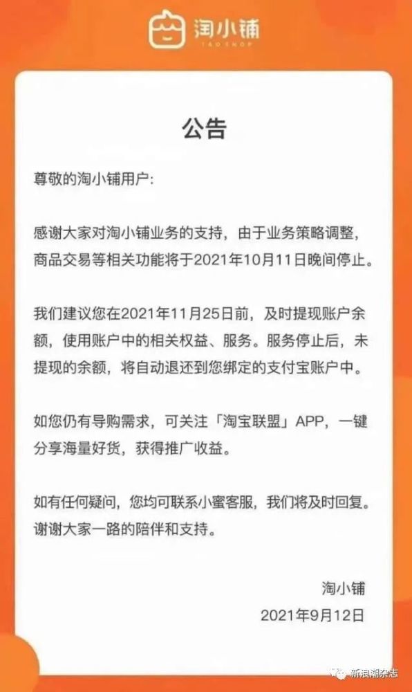 9月13日,阿里旗下应用淘小铺发布公告称:由于业务策略调整,商品教育等相关功能将于2021年10月11日晚间停止。公告建议淘小铺用户在2021年11月25日前,及时提现账户余额,使用账户中的相关权益、服务。