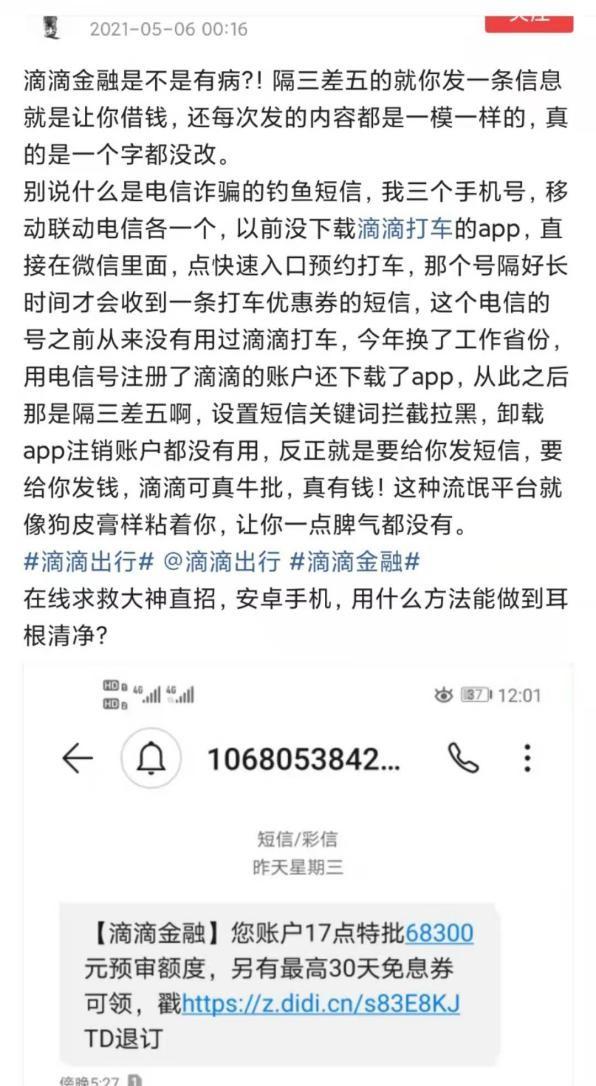 除记者收到推销宣传信息外,在其他网络平台上,也有网友发帖吐槽,不断接收到来自滴滴金融的营销短信。该网友表示,在注册了滴滴打车并下载了APP后,隔三岔五便会收到一条借贷短信,设置了关键词拦截,卸载APP都没有用,依旧会收到该公司发来的营销短信。