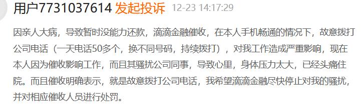 在黑猫投诉平台上,用户7731037614 投诉称,因亲人生病,导致暂时没有能力还款。滴滴金融催收在本人手机畅通的情况下,故意拨打公司电话(一天电话50多个,换不同号码,持续拨打),对用户工作造成严重影响。现在因为催收影响工作,而且其骚扰公司同事,导致心里、身体压力太大,已经头痛住院。而且催收明确向该用户表示,就是在故意拨打公司电话。
