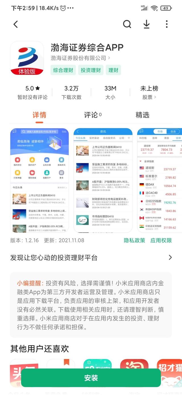 同样在小米应用商店里,记者搜索到“渤海证券综合APP”体验版,点击查看显示,该款App开发者是渤海证券股份有限公司,版本为1.2.16,更新时间是2021年11月8日。该款APP评价为五星,下载次数达3.2万。