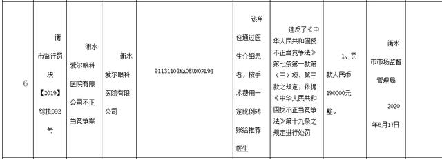 需要提及的是,2020年6月17日,衡水市市场监督管理局曾下发“衡市监行罚决【2019】综执092号”处罚文件,对衡水爱尔眼科医院有限公司处以19万元的罚款,处罚事由是该单位通过医生介绍患者,按手术费用一定比例转账给推荐医生。
