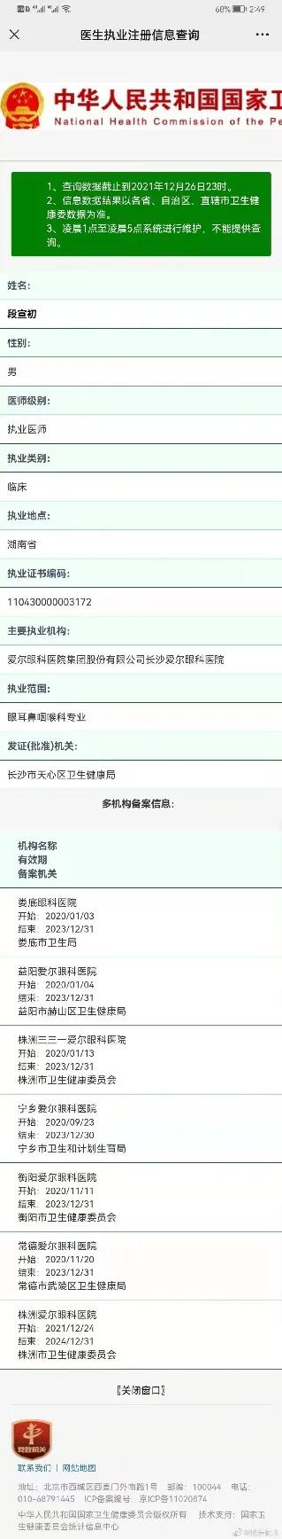 疯狂扩张背后,爱尔眼科的医生资质受到质疑。目前,已有不少网友爆料,爱尔眼科医院中,有大量持执业医师资质的医生“根据需要能够多挂几家医院尽量多挂”。例如,一位医院副院长同时挂靠上海爱尔眼科医院、成都爱尔眼科医院和长沙爱尔眼科医院,而在湖南省境内,还另外挂靠了当地七家市级爱尔眼科医院。