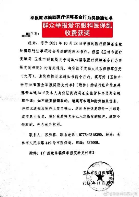 此外,有匿名网友曾向艾芬透露,其举报玉林爱尔眼科乱收费、欺诈骗取医保基金得到玉林市医疗保障局受理,由此获得505元奖励,而处罚事由为手术费过度收取。“玻璃体切除术和硅油取出术虽然是两个手术名称,但为同一个手术切口,因此第二个手术需减半收费,可是爱尔眼科欺负普通老百姓看不懂,第二个手术仍然100%收费,所以该网友才向医保局举报。”艾芬向《中国科技投资》记者解释道。
