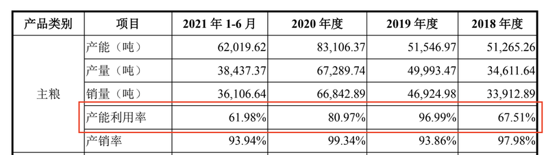 短短两年内乖宝宠物主粮系列和零食系列产能分别上升了62.11%和49.82%,但同时两种品类产能利用率也分别下滑至了61.98%、86.56%,虽然2021年上半年属于销售淡季产能未能完全利用,但报告期内整体产能利用率也均有下滑趋势。