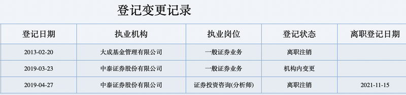 中国证券业协会官网显示,陈龙自2019年4月24日在中泰证券从事证券投资咨询分析师,于2021年11月15日登记离职注销,2013年起曾在大成基金履职。公开信息显示,期间,陈龙还曾在交银施罗德基金管理有限公司宏观策略分析师、高级策略分析师和基金经理等职务。![]()