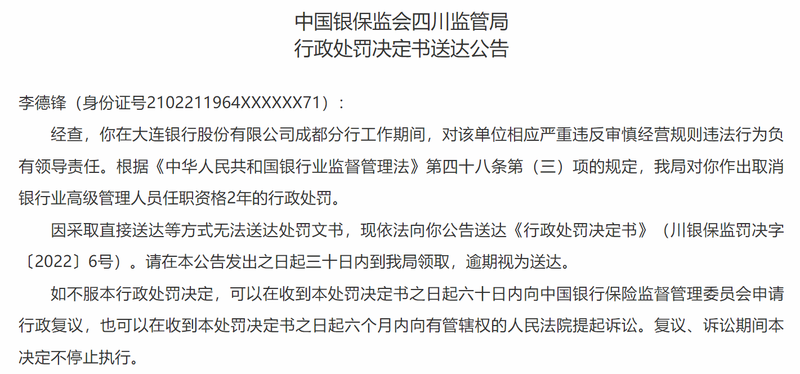 1月17日,银保监会四川监管局公示一则行政处罚决定书送达公告显示,李德锋在大连银行成都分行工作期间,对该单位相应严重违反审慎经营规则违法行为负有领导责任。对此,四川银保监局对其作出取消银行业高级管理人员任职资格2年的行政处罚。