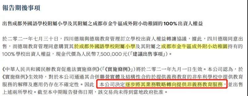 今年8月,成实外发布公告称,拟出售旗下成都外国语学校附属小学及成都市金牛区成外附小幼稚园的100%出资人权益,现金代价为750万元。对于出售原因,集团称主要是受到《民促法》的影响。