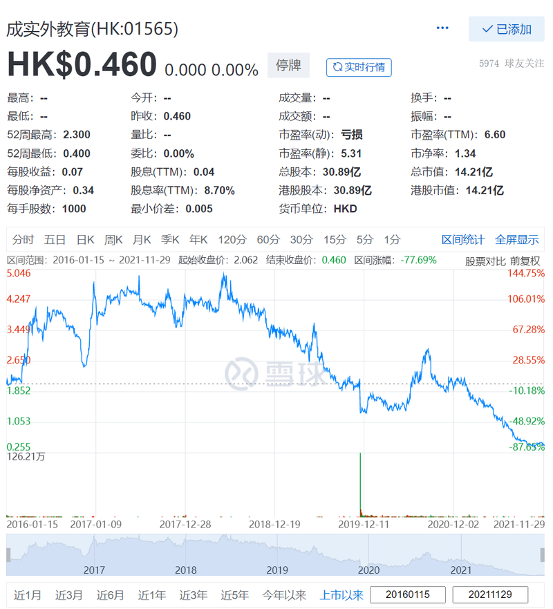 但资本市场对于成实外似乎并不买账,截至目前,成实外股价仅余0.46港元,自上市至今跌幅已达77.69%。