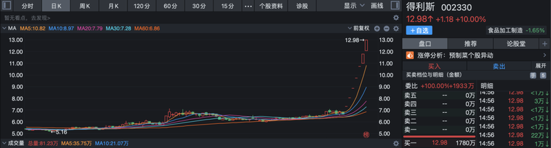 1月20日,预制菜概念股得利斯(002330.SZ)也在收到深交所问询函依然后斩获7连板,截至收盘,公司股价报收12.98元/股,总市值达到65.46亿元。