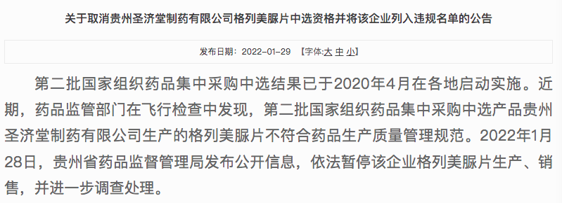 1月29日,国家组织药品联合采购办公室发布《关于取消贵州圣济堂制药有限公司格列美脲片中选资格并将该企业列入违规名单的公告》称,药品监管部门在飞行检查中发现,第二批国家组织药品集中采购中选产品贵州圣济堂制药有限公司生产的格列美脲片不符合药品生产质量管理规范。