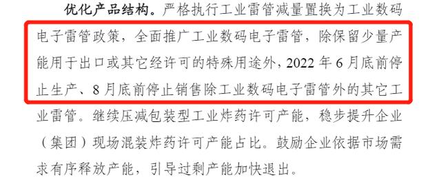 一位私募行业人士向记者表示,民爆概念受资金炒作,究其原因,是基建中开山辟路、采矿挖掘的定向爆破都离不开的小小雷管,行业业绩普遍都有稳定的保障。此外,从政策上看,2021年11月15日,工业和信息化部印发《“十四五”民用爆炸物品行业安全发展规划》,在优化产品结构中提出,严格执行工业雷管减量置换为工业数码电子雷管政策,全面推广工业数码电子雷管,除保留少量产能用于出口或其它经许可的特殊用途外,2022年6月底前停止生产、8月底前停止销售除工业数码电子雷管外的其它工业雷管。继续压减包装型工业炸药许可产能,稳步提升企业(集团)现场混装炸药许可产能占比。鼓励企业依据市场需求有序释放产能,引导过剩产能加快退出。