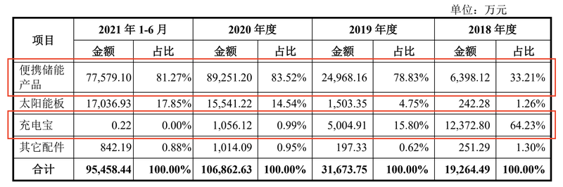 在2018年时,充电宝是华宝新能最主要的产品,公司64.23%的收入均来自充电宝产品,便携储能产品销售收入占比仅为33.21%,而到2021年上半年时,便携式储能产品销售占比就达到81.27%,而充电宝销售金额只剩0.22万元,占比几乎归零。![]()