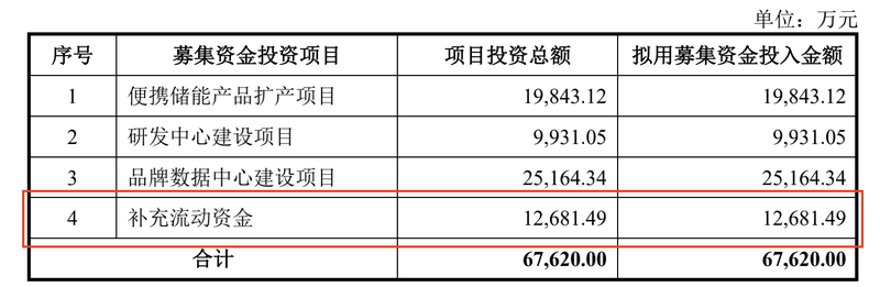 另外,从募资情况来看,华宝新能计划通过IPO募集资金约6.76亿元,其中2.52亿元和1.98亿元用于“品牌数据中心建设项目”和“便携储能产品扩产项目”,而花费第三大的项目则为补充流动资金,大约将占用1.27亿元,而这尚不及近两年公司分红总额。![]()