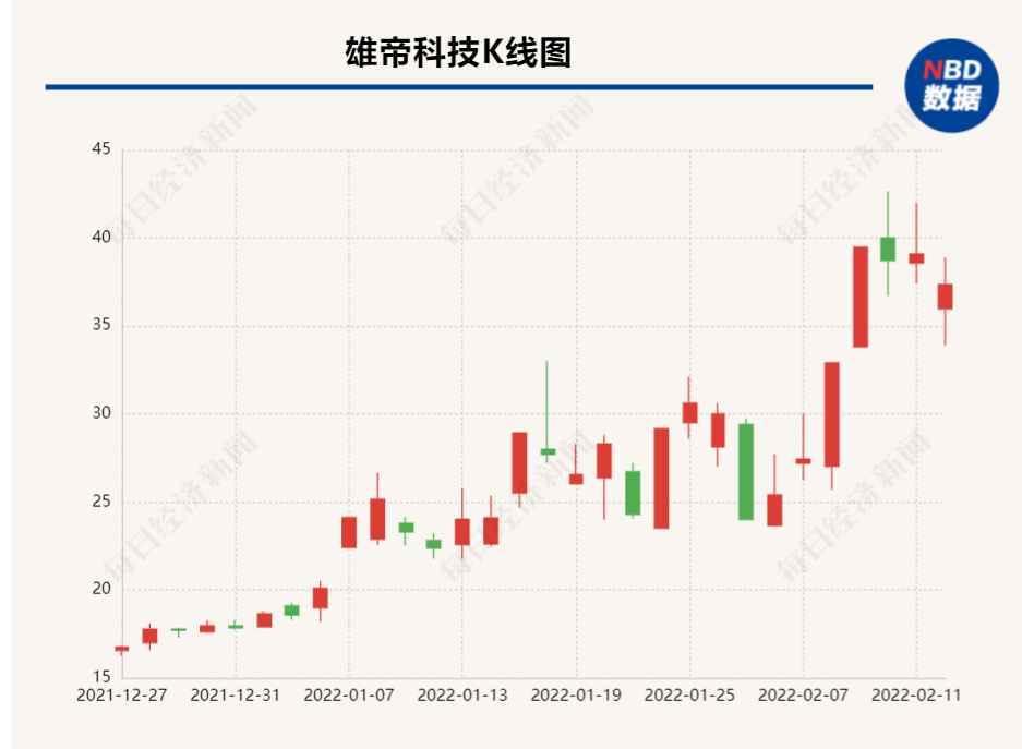 今年以来,投资者对雄帝科技涉及的数字人民币概念十分关注,持续通过互动平台等方式询问公司在数字人民币业务上的布局情况。与此同时,A股数字人民币概念景气度高企,雄帝科技股价也是一飞冲天。今年以来,公司股价从不足18元/股上涨至目前的37.35元/股(截至2月14日收盘),市值达到50.73亿元,累计上涨约26.53亿元。