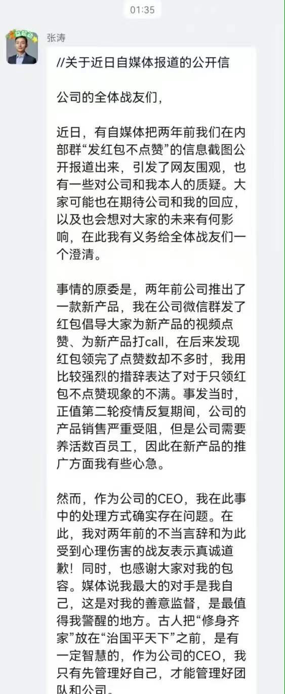 “事发当时正值第二轮疫情反复期间,公司产品销售严重受阻,但是公司需要养活数百员工,因此在新产品的推广方面我有些心急。然而,作为公司的CEO,我在此事中的处理方式确实存在问题。在此,我对两年前的不当言辞和为此受到心理伤害的战友表示真诚道歉!”张涛表示,未来三年内,只要当年收入达成公司目标,会将其本人当年工资50%以红包形式发放给员工。
