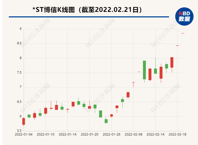 2月21日,*ST博信开盘一字涨停,报8.85元/股,此前两个交易日,公司股价也已连续涨停。