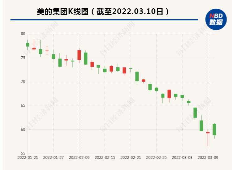记者注意到,美的集团选择在这个时候再抛股份回购计划的原因或许还在于,近日美的集团的股价也持续下跌。2022年1月4日,美的集团的开盘价还高达74元/股,而截至3月10日收盘,美的集团的股价是58.87元/股。进入2022年以来,公司股价累计跌幅达20%。