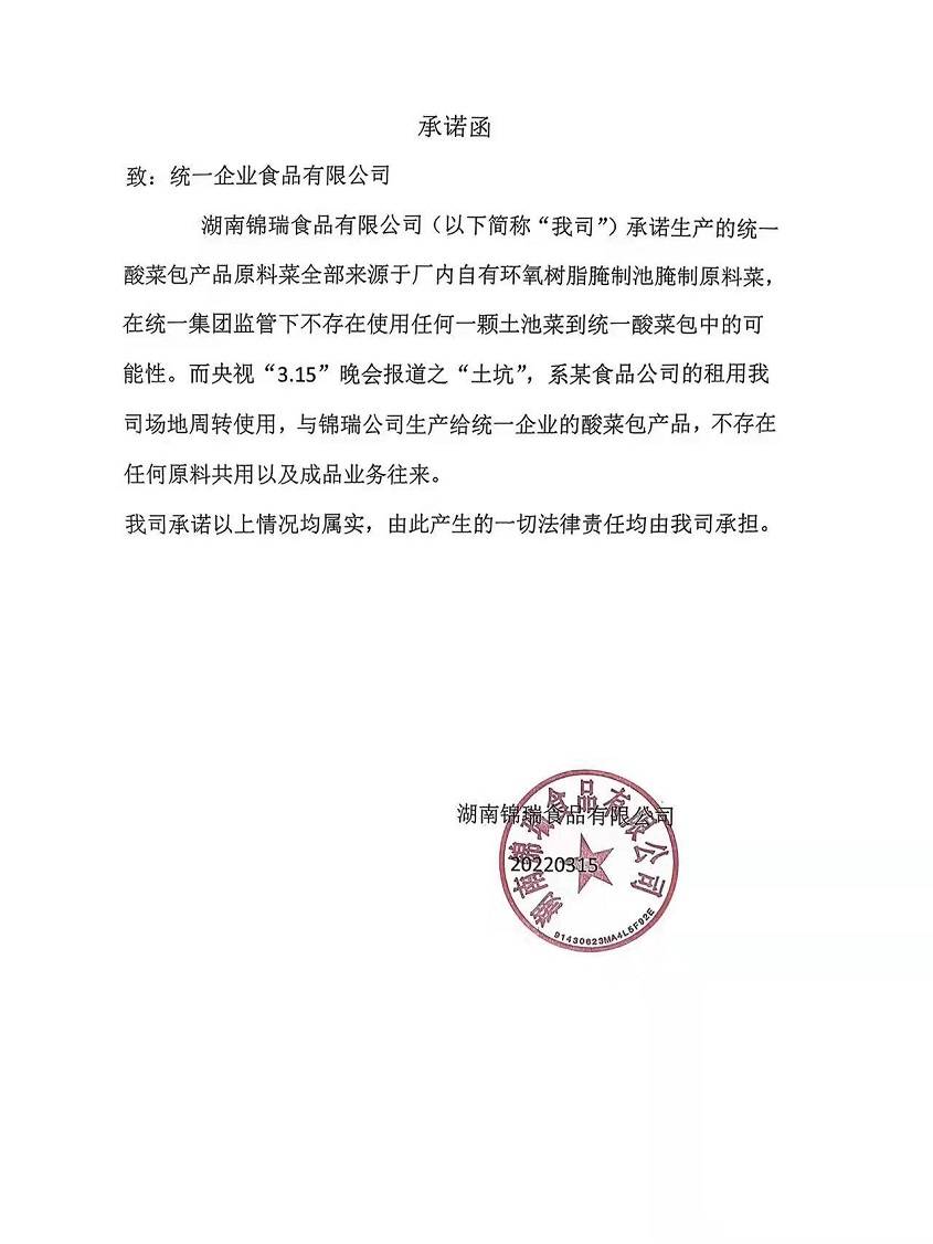 同时,统一企业发布了供应商湖南锦瑞的承诺函,其中提到公司承诺生产的统一酸菜包产品原料菜全部来源于厂内自有腌制池。
