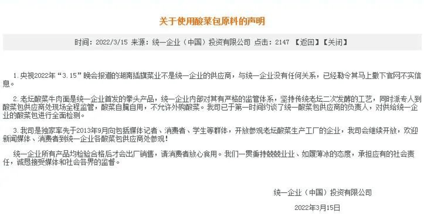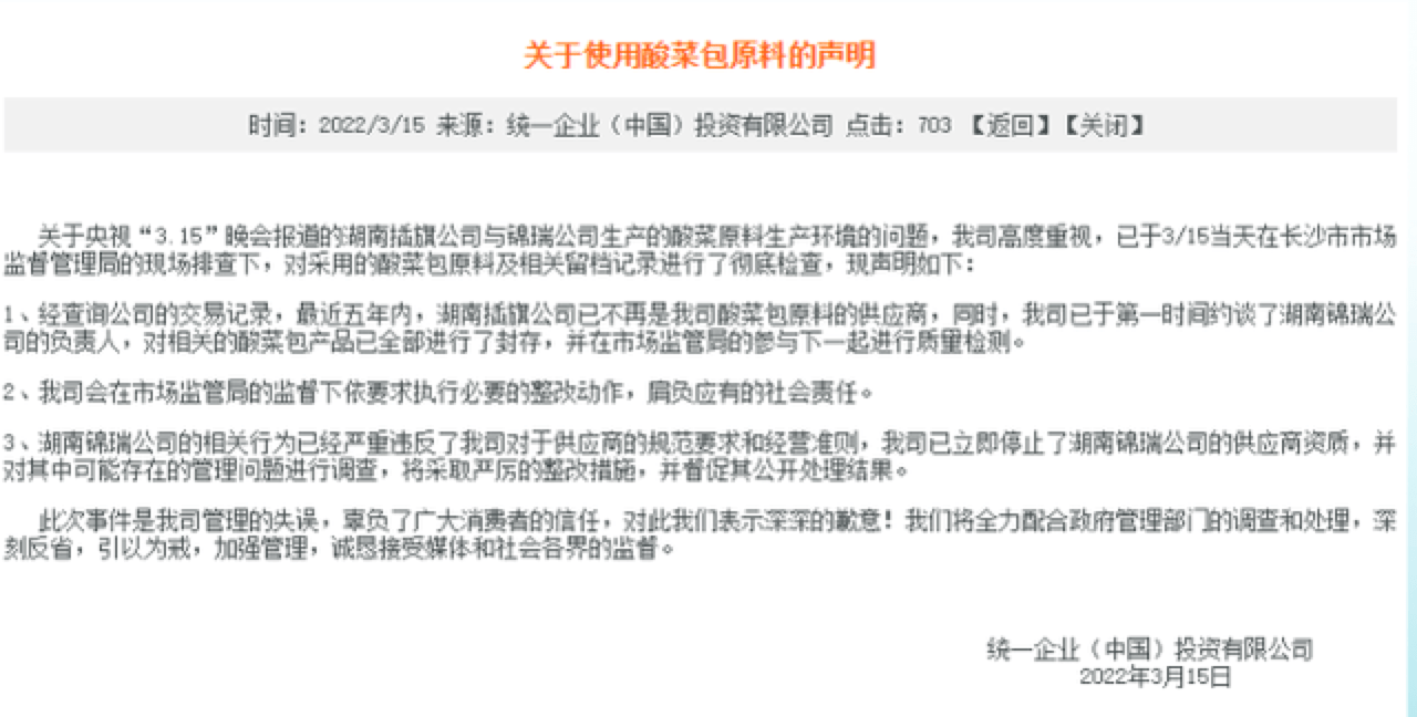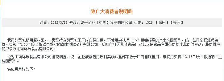 3月16日,统一企业在官网再发声明称:经对湖南锦瑞食品有限公司(简称“湖南锦瑞”)连夜调查,统一企业酸菜包用原料菜确认全部来源于厂内自腌自用,未使用央视“3.15”晚会报道的“土坑酸菜”。