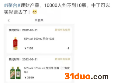31日18点后,首日申购结果出炉。据统计,贵州茅台酒(珍品)4599元/瓶,投放量为3526瓶,申购人数为1402254人,申购成功人数为3526人,中签率为0.25%;贵州茅台酒(壬寅虎年)2499元/瓶,投放量为8934瓶,申购人数为2205509人,申购成功人数为8934人,中签率为0.41%;贵州茅台酒(壬寅虎年)3599元/盒,投放量为376瓶,申购人数为1225451人,申购成功人数为376人,中签率为0.031%;茅台1935每瓶1188元,投放量为13492瓶,申购人数为1367000人,申购成功人数为13492人,中签率为0.99%。
