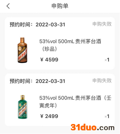 31日上午9:00-10:00,“i茅台”APP上可预约申购53度500ml贵州茅台酒(壬寅虎年)、53度500ml茅台1935、53度375ml*2(壬寅虎年)、53度500ml贵州茅台酒(珍品)等四款产品,都是官方指导价,分别为2499元、1188元、3599元及4599元。