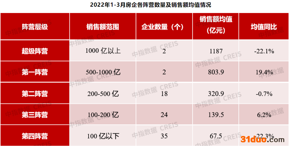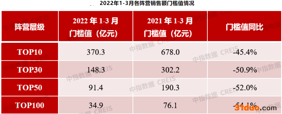 3月31日,中指研究院、克而瑞、亿翰智库等多家研究机构发布了2022年一季度中国房地产企业销售业绩情况。从数据上看,楼市下行压力仍未缓解,整体销售依旧低迷,除了TOP10房企阵营外,其余阵营销售门槛值均同比腰斩。