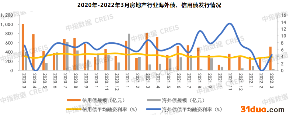3月份,房地产企业信用债与海外债发行规模同比均大幅下降。其中,信用债发行规模为514.91亿元,环比上升78.97%,相较于去年3月811.53亿元,同比下降36.55%;内地房企海外债发行规模为25.58亿元,相较于去年3月132.53亿元,同比下降80.7%。