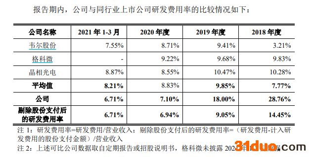 不过,《每日经济新闻》记者注意到,报告期内思特威剔除股份支付后的研发费用率分别为14.45%、9.05%、6.94%、6.71%,呈现下滑趋势,且从2019年起,该数据低于同行业上市公司。